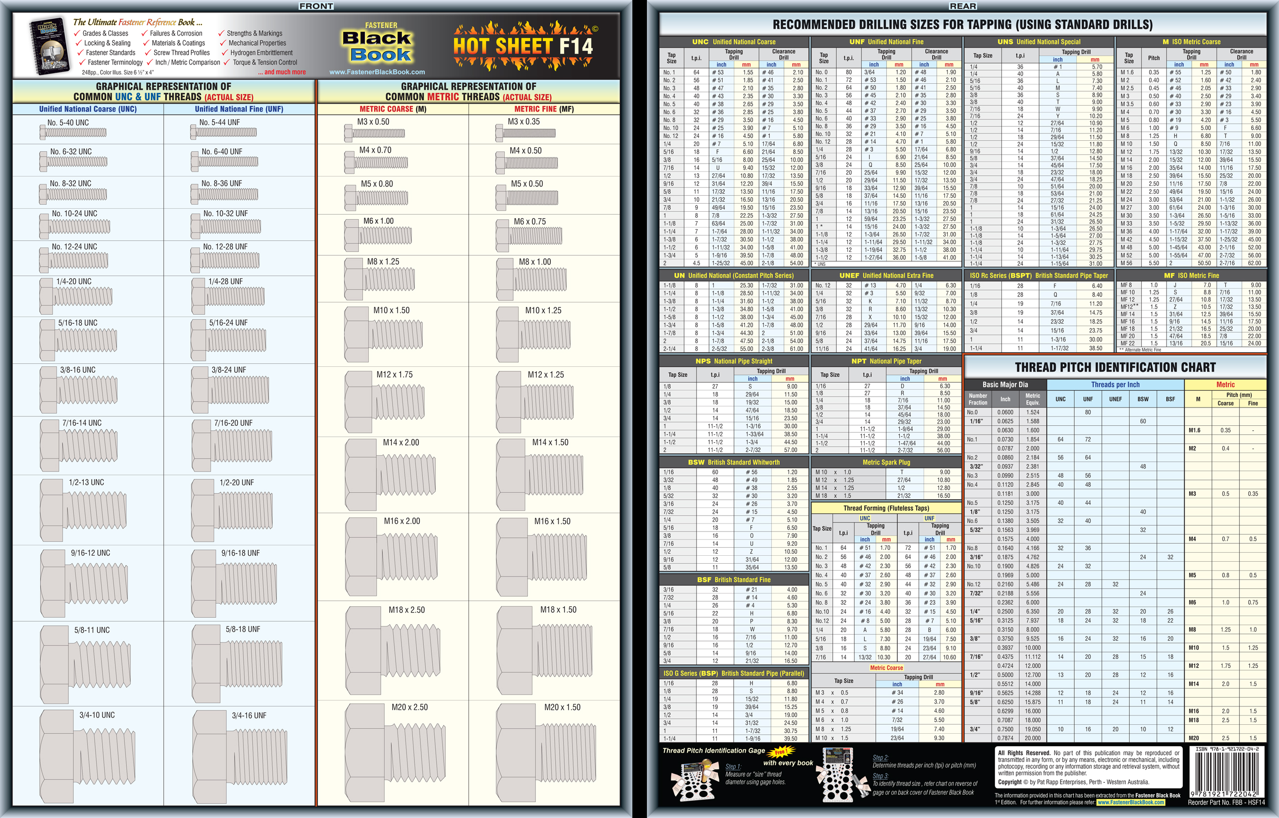 They are convenient, portable and durable. All the content provided in the HOT SHEETS have been extracted from the Fastener Black Books. Therefore, these HOT SHEETS provide very quick referencing for a frequent basis. For comprehensive information the full Fastener Black Book should be referenced. Each Sheet has data printed both sides with laminated protection 8.5”x11” (215.90mm x 279.40mm).