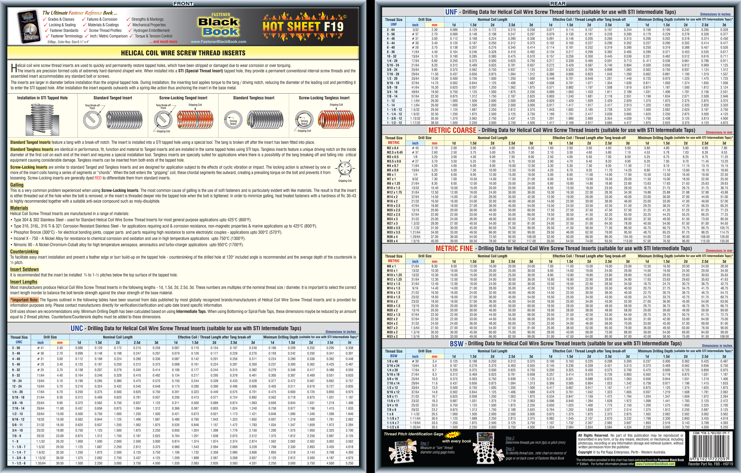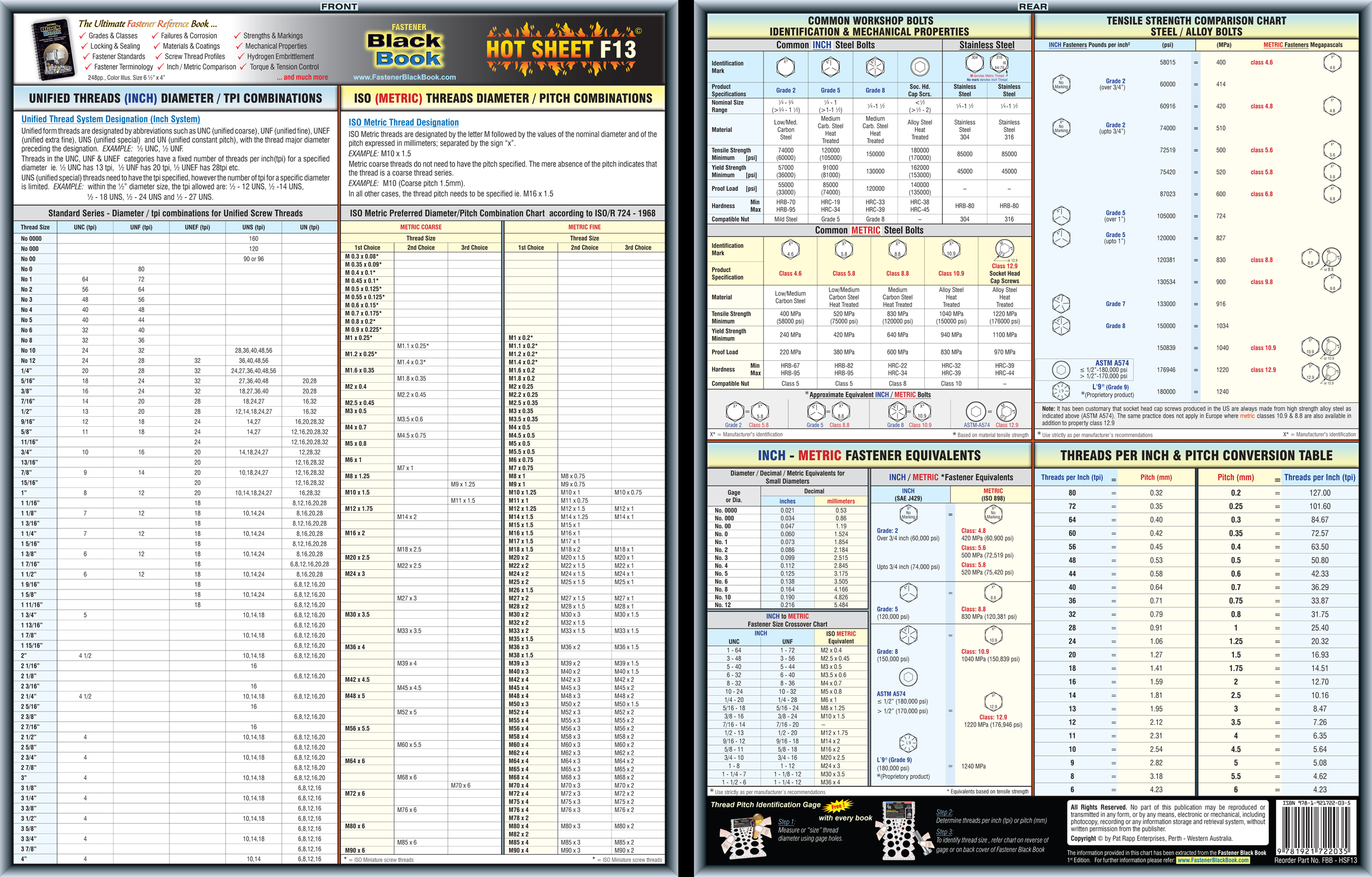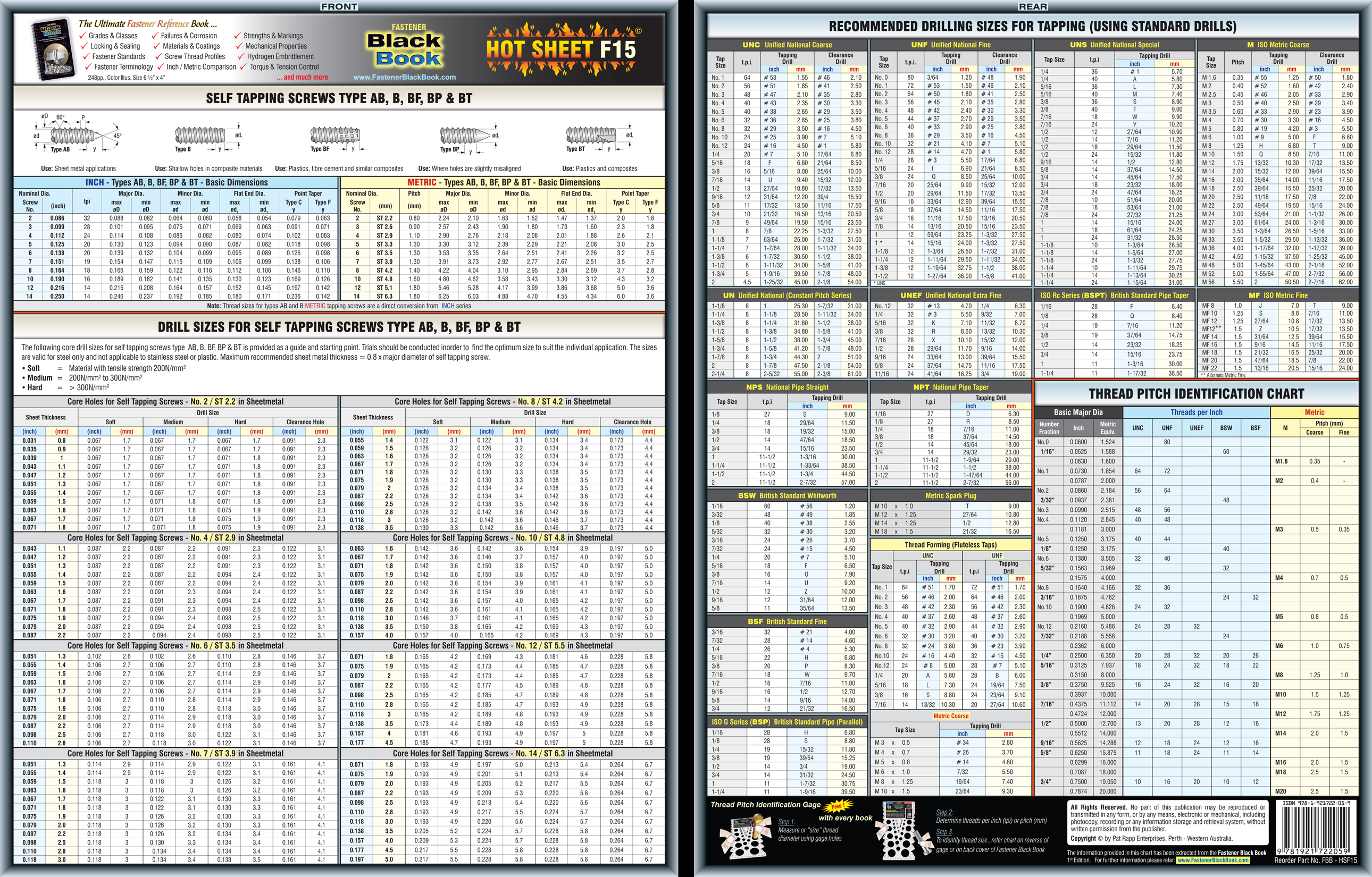 They are convenient, portable and durable. All the content provided in the HOT SHEETS have been extracted from the Fastener Black Books. Therefore, these HOT SHEETS provide very quick referencing for a frequent basis. For comprehensive information the full Fastener Black Book should be referenced. Each Sheet has data printed both sides with laminated protection 8.5”x11” (215.90mm x 279.40mm).